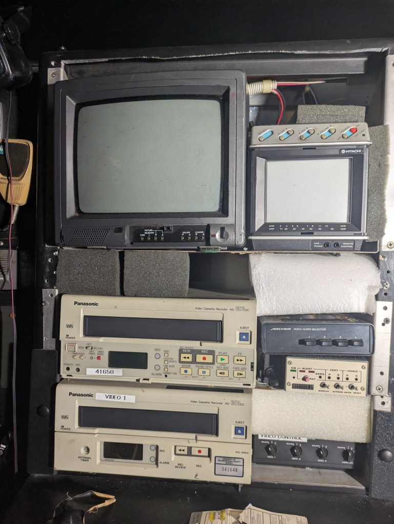 - Panasonic AG-1070DC VCRs: These are industrial 12-volt DC units. Unlike home VCRs, these were designed to run off battery power and survive the vibrations of a moving vehicle. They provided the visual proof of who met whom and when.